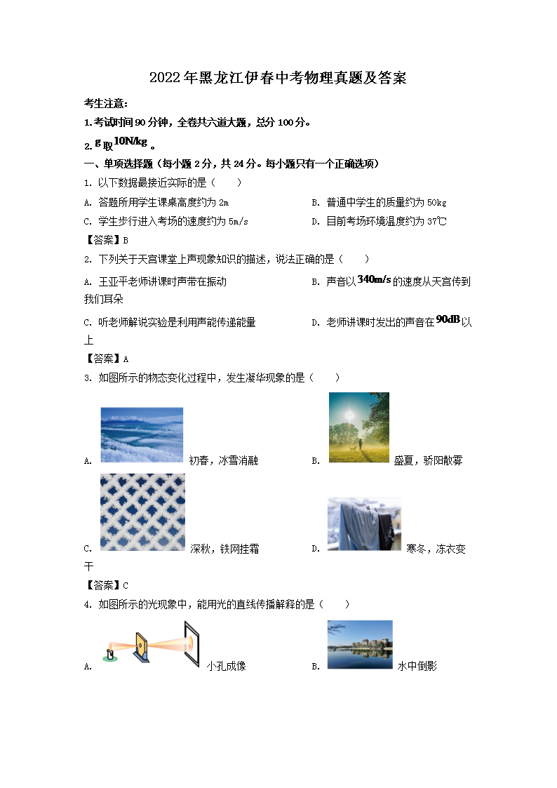【文档名称】 2022年黑龙江伊春中考物理真题及答案(Word版).doc