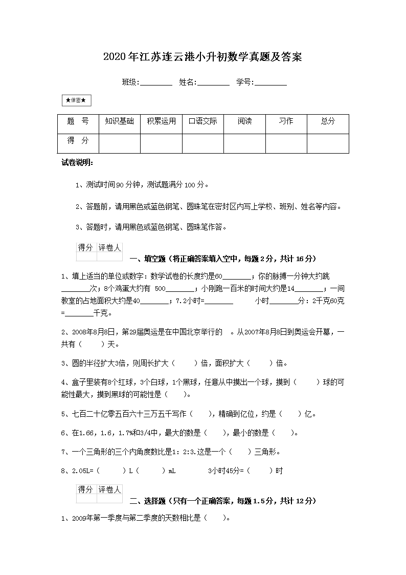 【文档名称】 2020年江苏连云港小升初数学真题及答案(Word版).doc