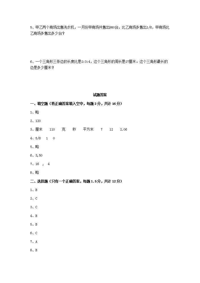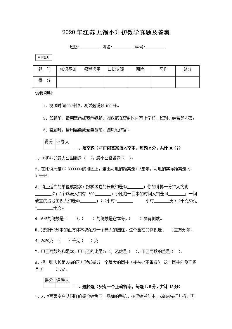 【文档预览】 无忧考网整理发布2020年江苏无锡小升初数学真题及答案(Word版),前五页预览如下: