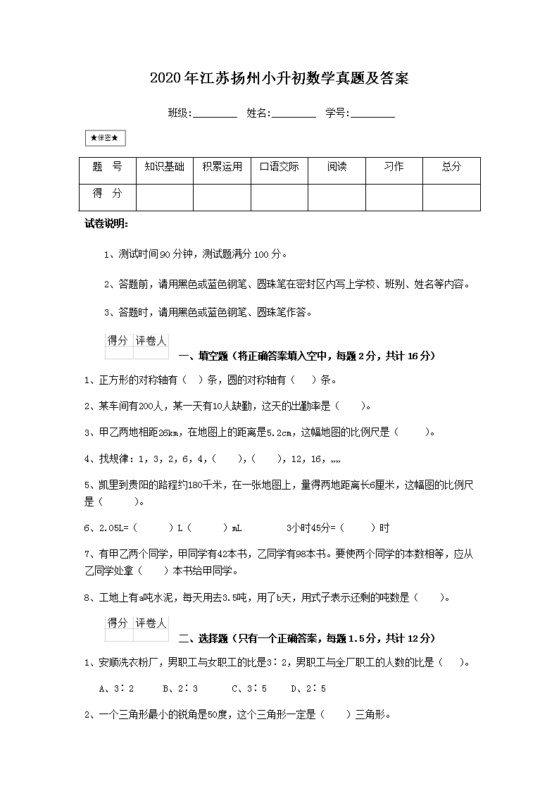 【文档名称】 2020年江苏扬州小升初数学真题及答案(Word版).doc