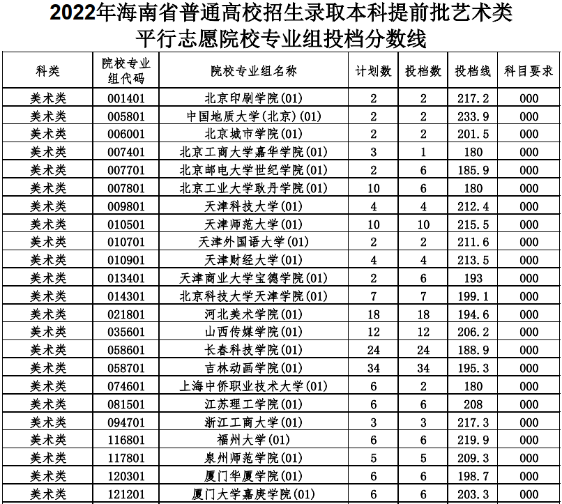 2022年海南省普通高校招生录取本科提前批艺术类平行志愿院校专业组投档分数线
