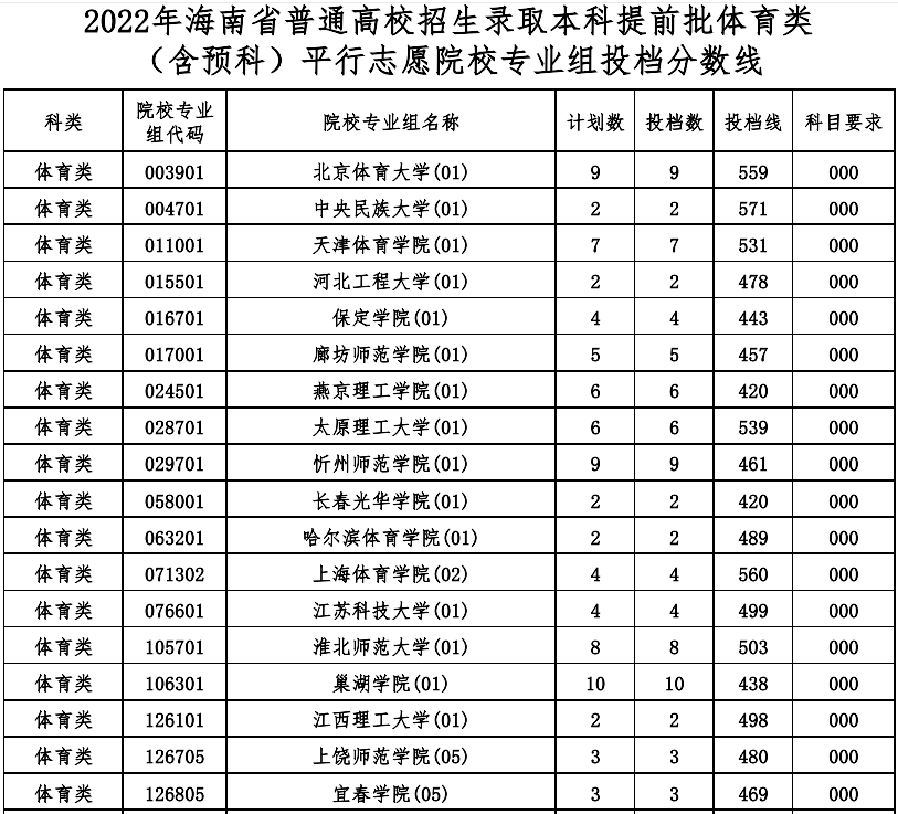 2022年海南普通高校招生录取本科提前批体育类(含预科)平行志愿院校专业组投档分数线