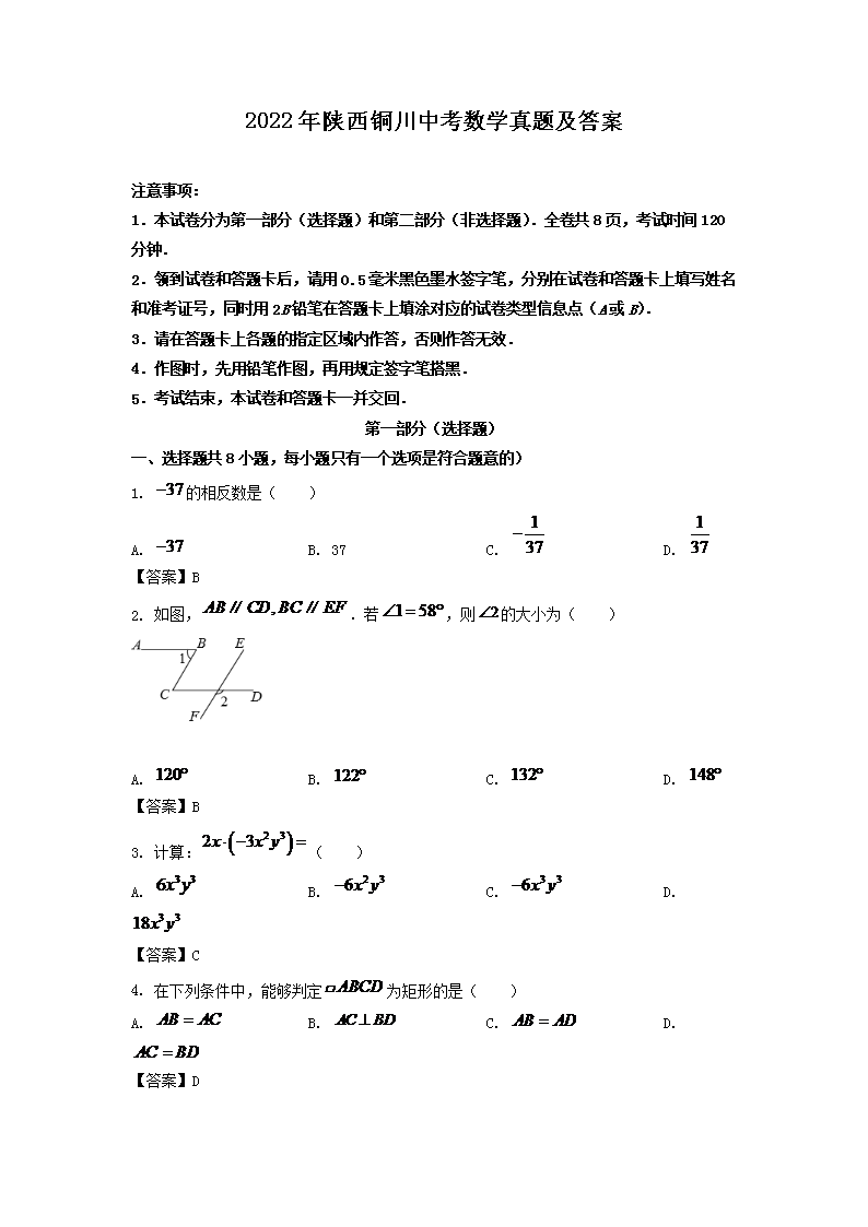 【文档名称】 2022年陕西铜川中考数学真题及答案(Word版).doc