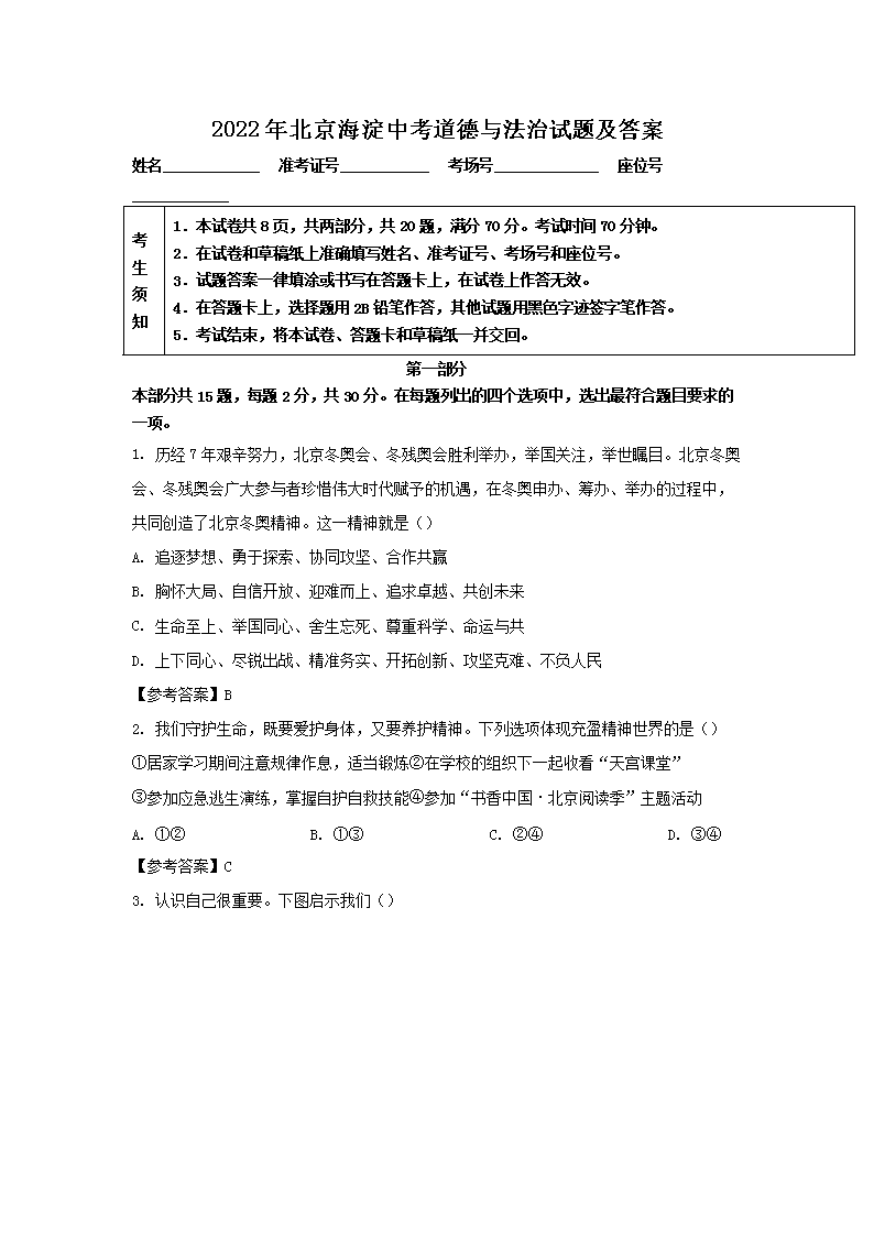 【文档名称】 2022年北京海淀中考道德与法治试题及答案(Word版).doc