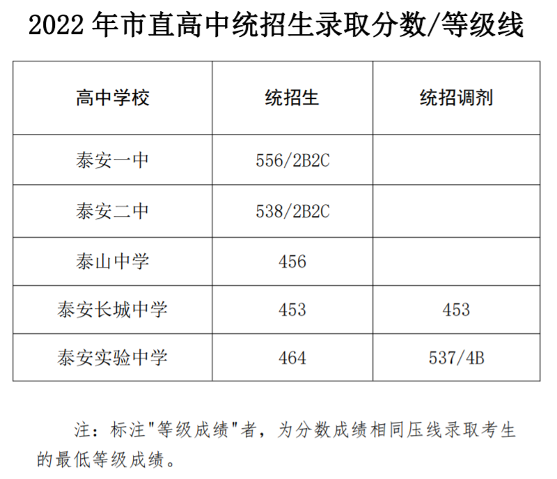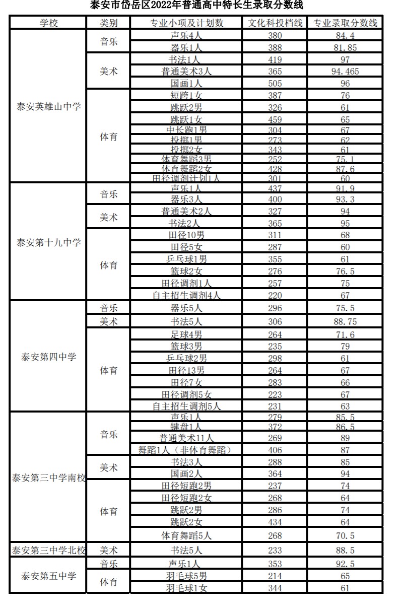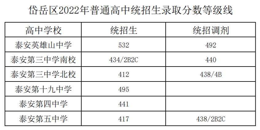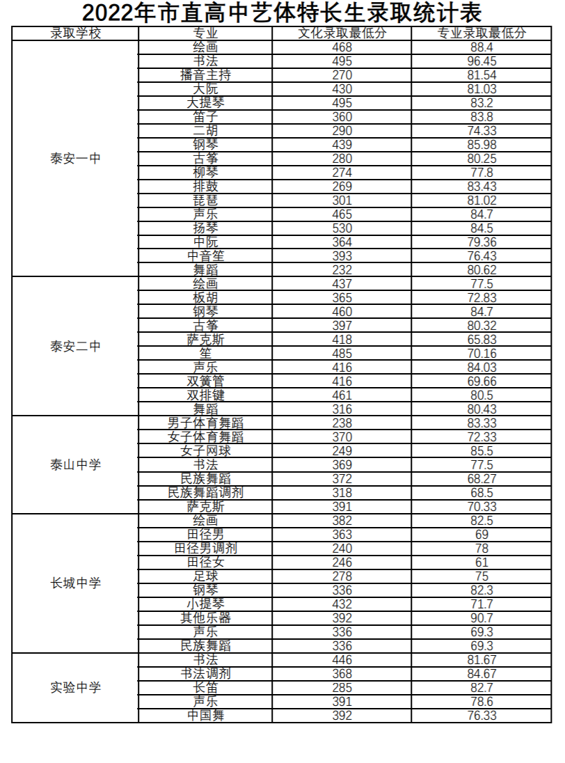 2022年泰安市直高中、岱岳区普通高中统招生、艺体特长生录取分数线