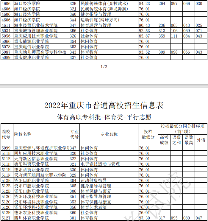 2022年重庆市普通高校招生体育高职专科批-体育类-平行志愿