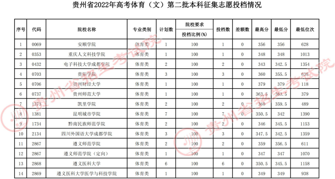 忧考网体育高考频道从贵州省招生考试院了解到,贵州省2022年高考体育第二批本科征集志愿投档情况已公布,详情如下: