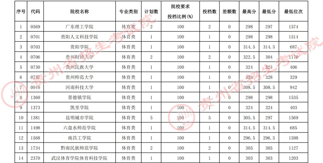 贵州2024年普通高校招生体育类专业录取控制分数线公布