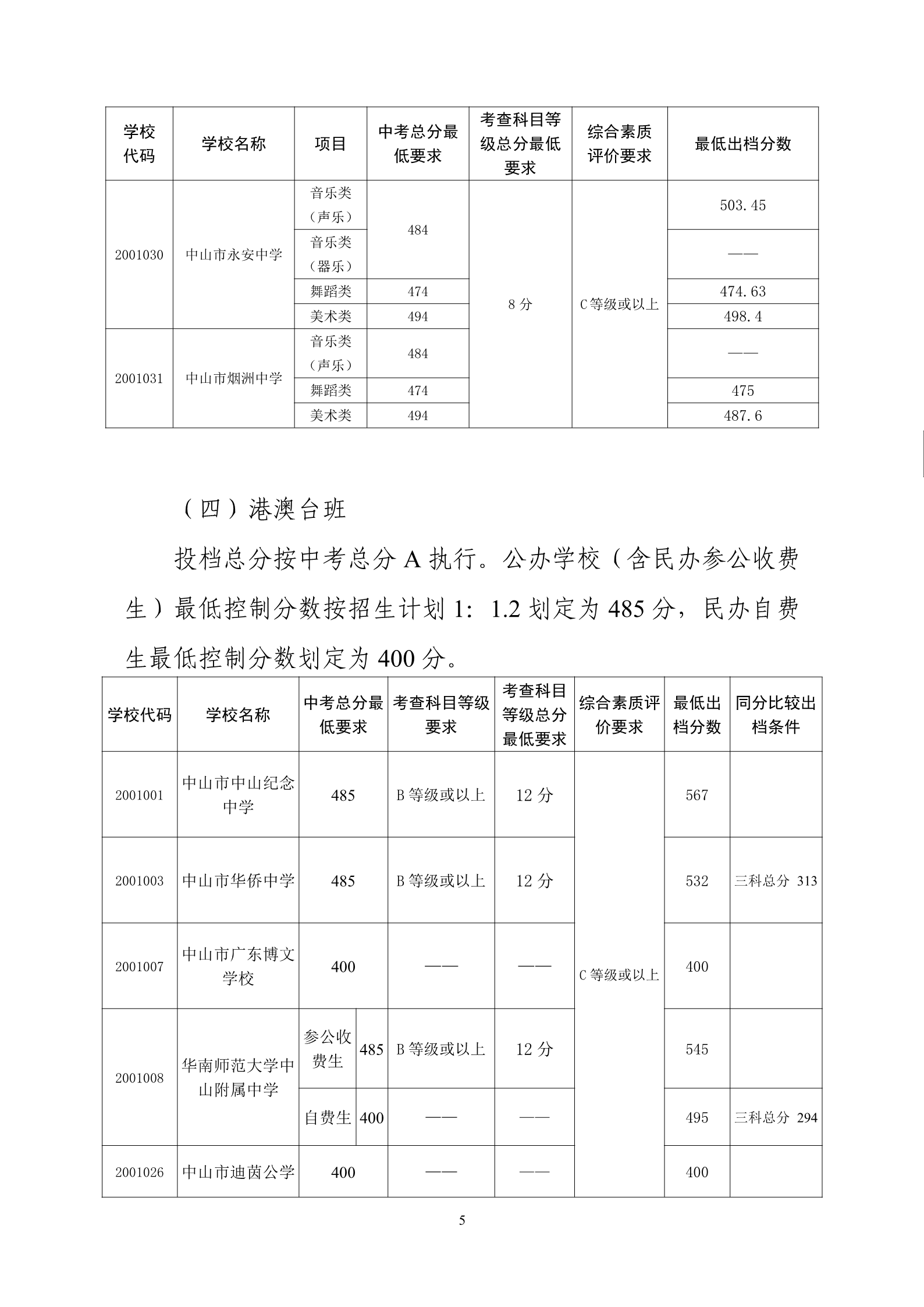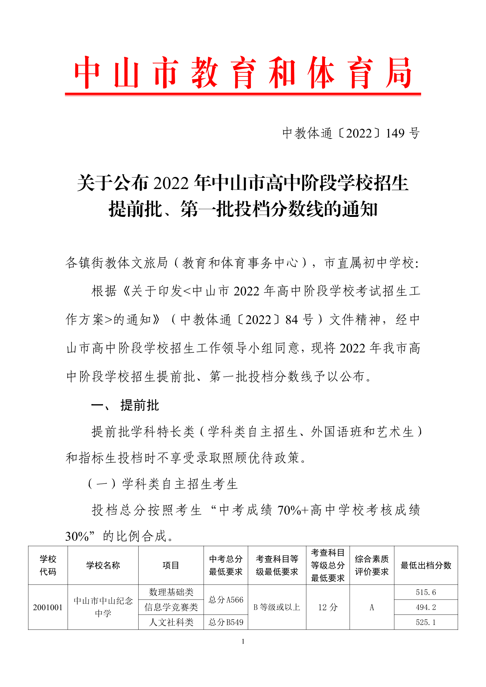 2022通149-关于公布2022年中山市高中阶段学校招生提前批、第一批次投档分数线的通知.pdf
