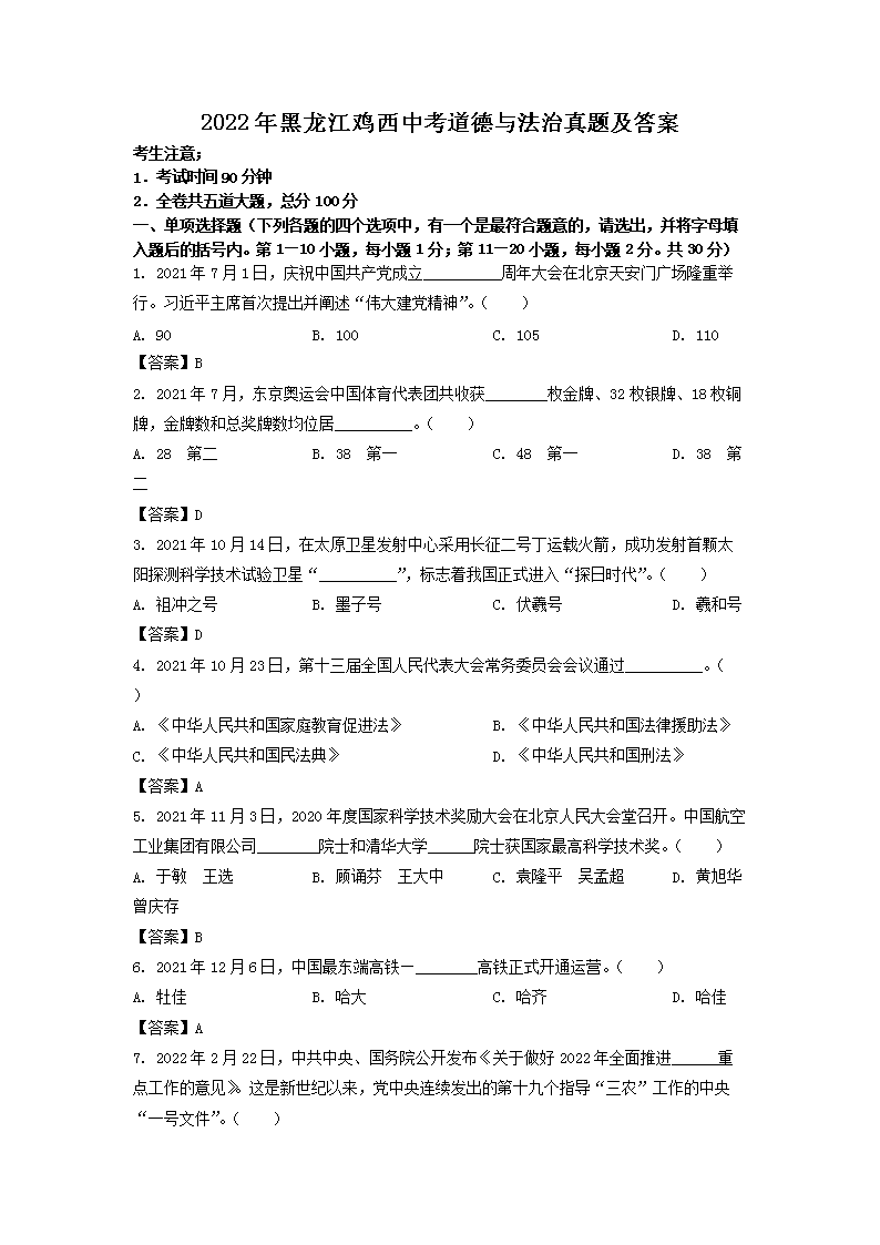【文档名称】 2022年黑龙江鸡西中考道德与法治真题及答案(Word版).doc