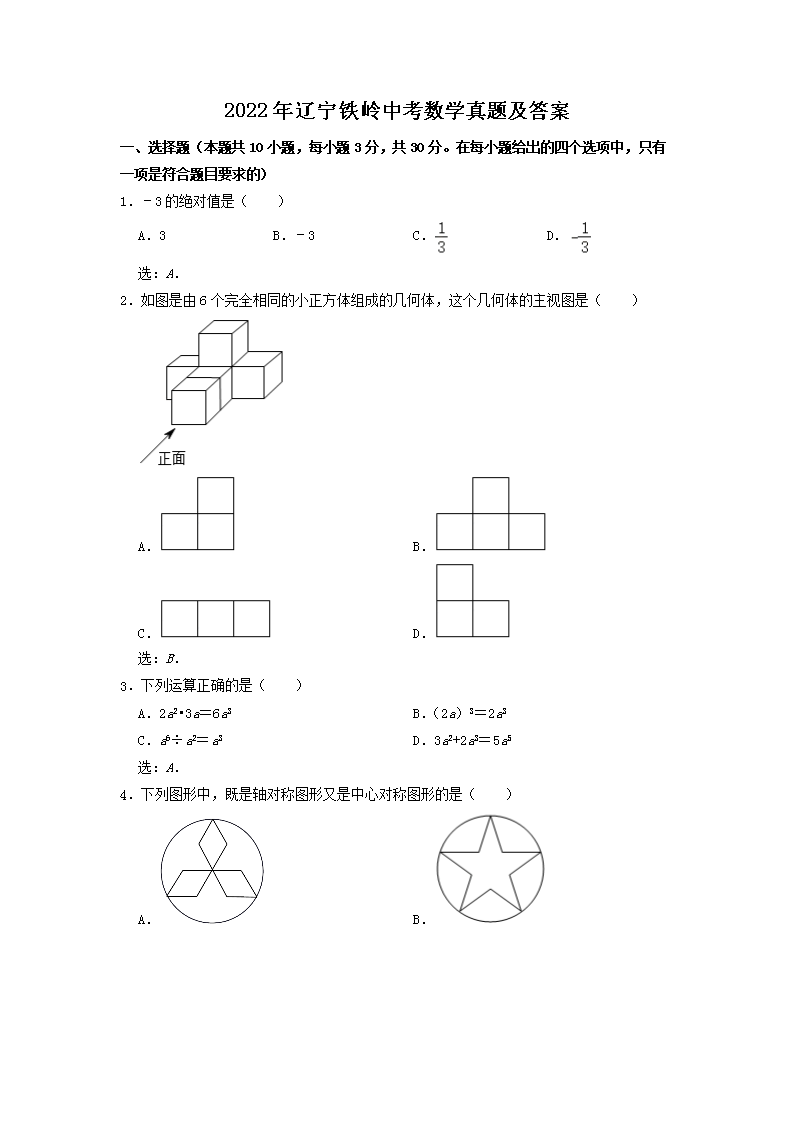 【文档名称】 2022年辽宁铁岭中考数学真题及答案(Word版).doc
