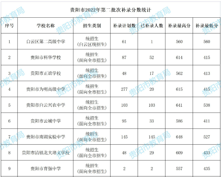 无忧考网中考频道从贵阳市教育局了解到,贵阳2022年高中阶段学校第二批次补录、第三批次录取分数线统计已公布,详情如下: