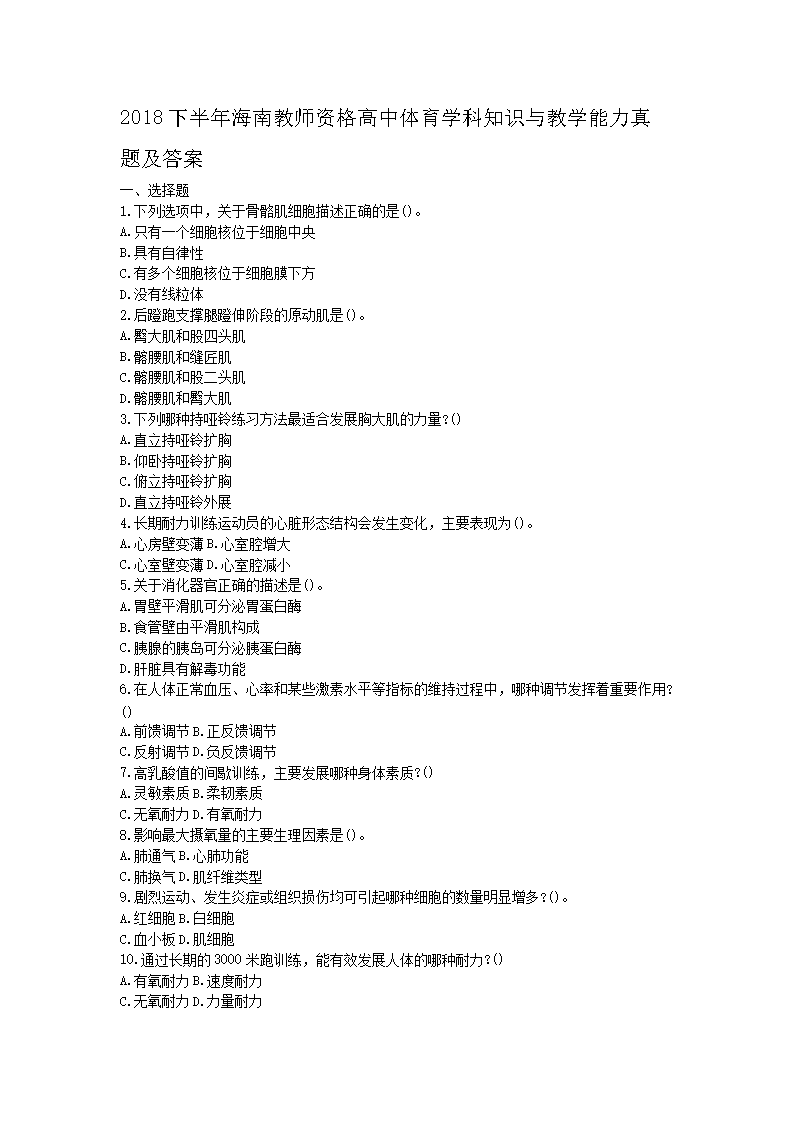 【文档名称】 2018下半年海南教师资格高中体育学科知识与教学能力真题及答案(Word版).doc