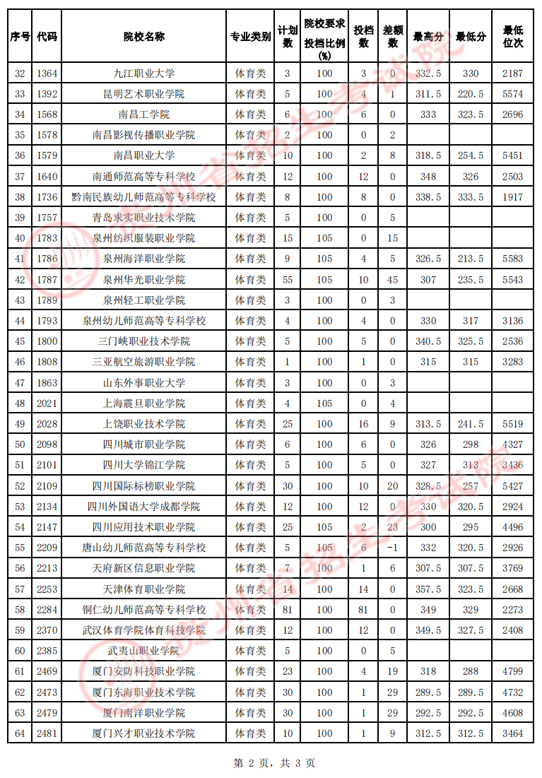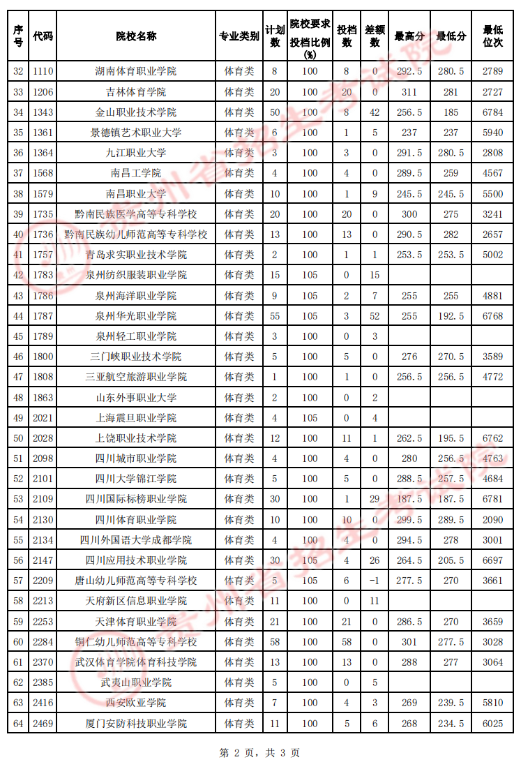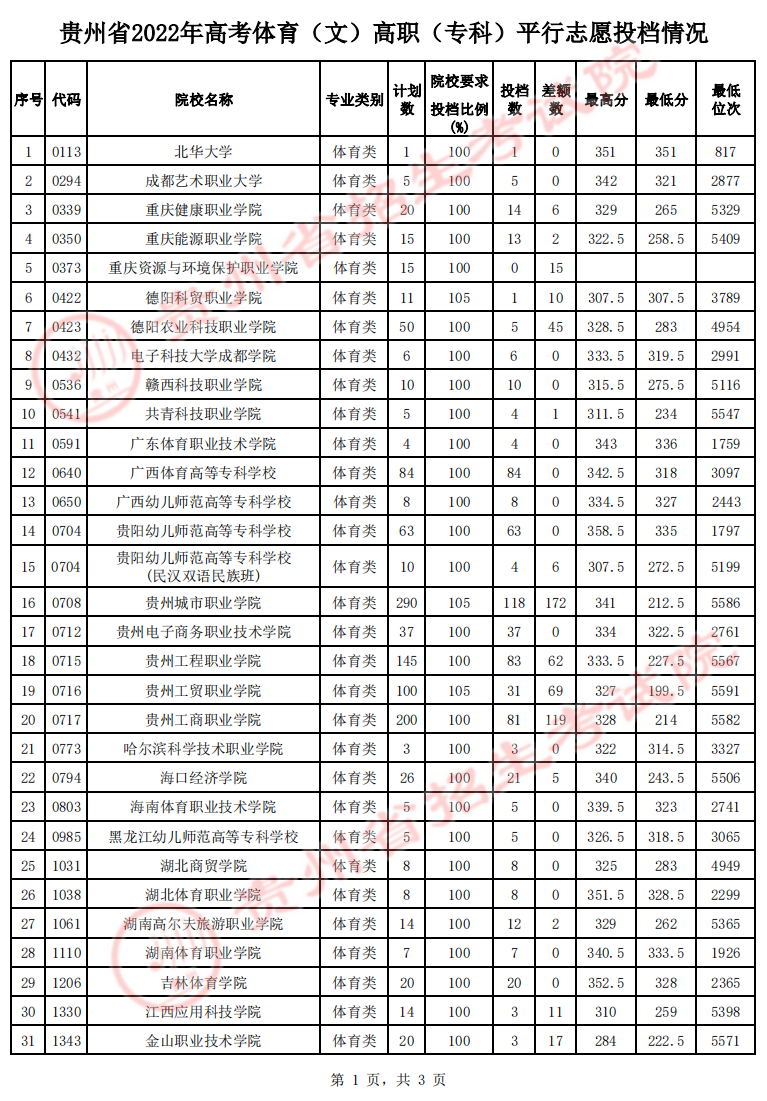 贵州省2022年高考体育类高职(专科)平行志愿投档情况