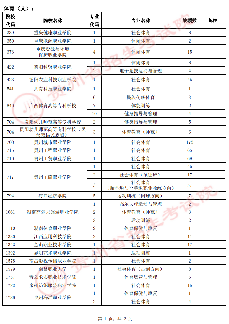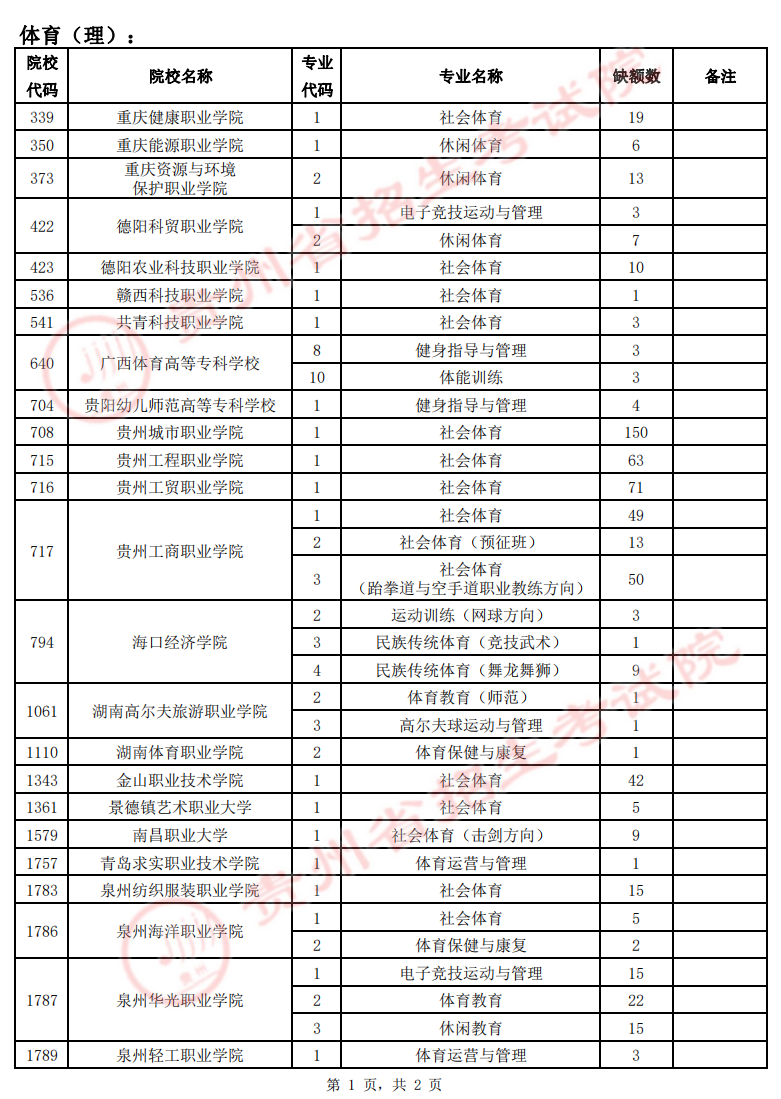 体育类高职(专科)院校平行志愿投档后,部分院校仍有缺额。现进行网上征集,考生可根据缺额情况,及时补报志愿。