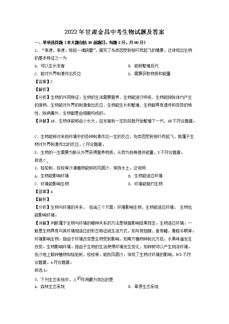 【文档预览】 无忧考网整理发布2022年甘肃金昌中考生物试题及答案(Word版),前五页预览如下:
