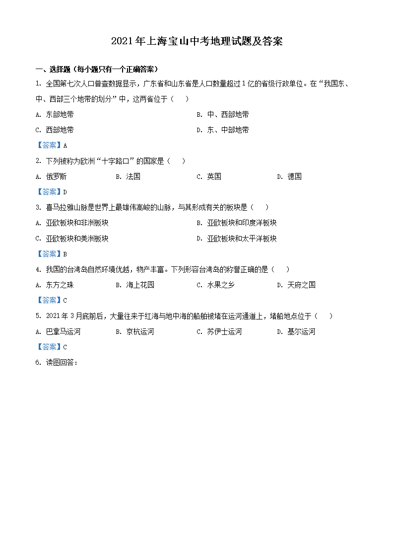 【文档名称】 2021年上海宝山中考地理试题及答案(Word版).doc