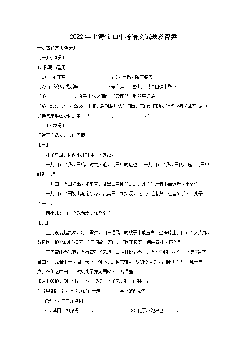 【文档名称】 2022年上海宝山中考语文试题及答案(Word版).doc