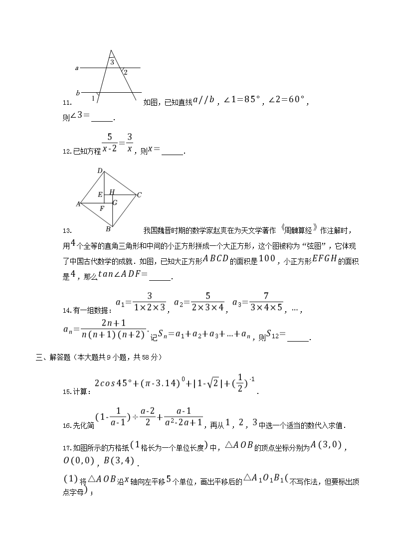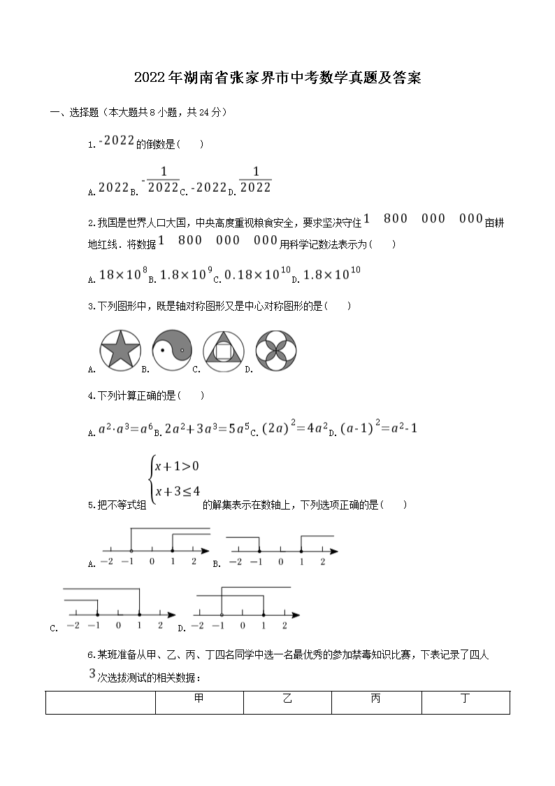 【文档名称】 2022年湖南省张家界市中考数学真题及答案(Word版).doc