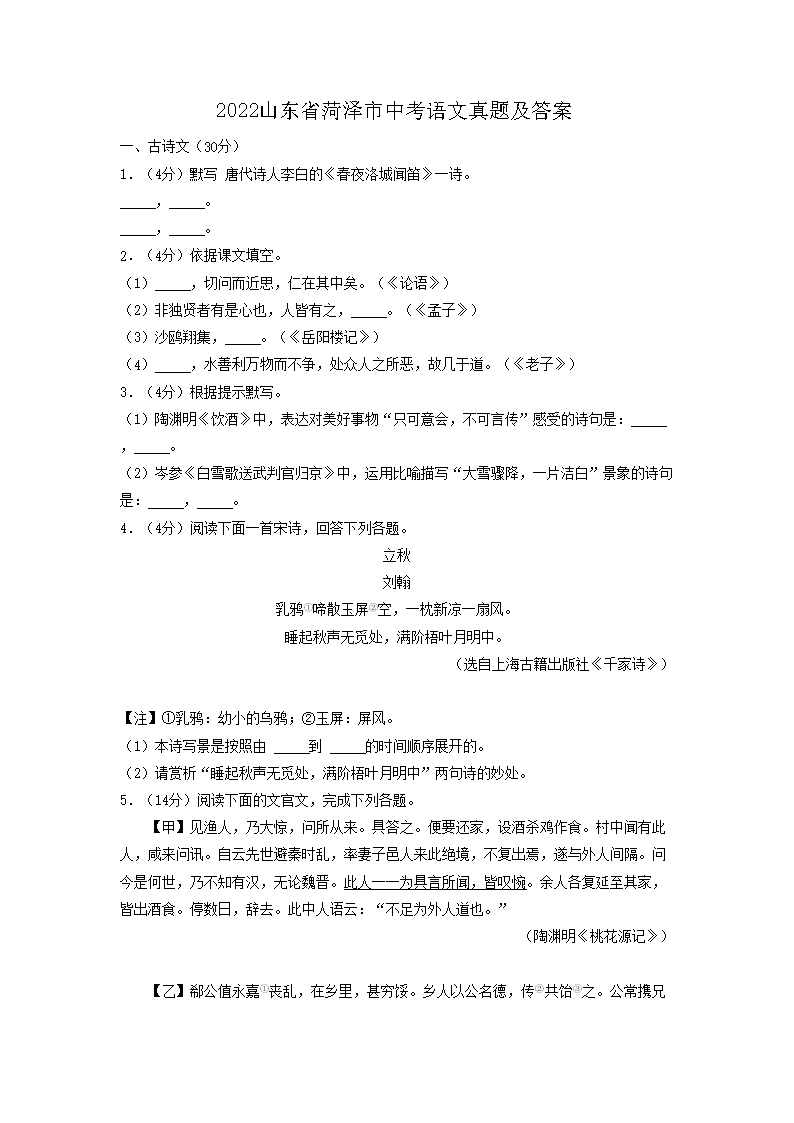 【文档名称】 2022山东省菏泽市中考语文真题及答案(Word版).doc
