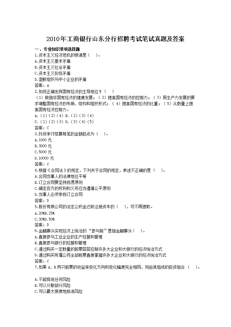 【文档名称】 2010年工商银行山东分行招聘考试笔试真题及答案(Word版).doc