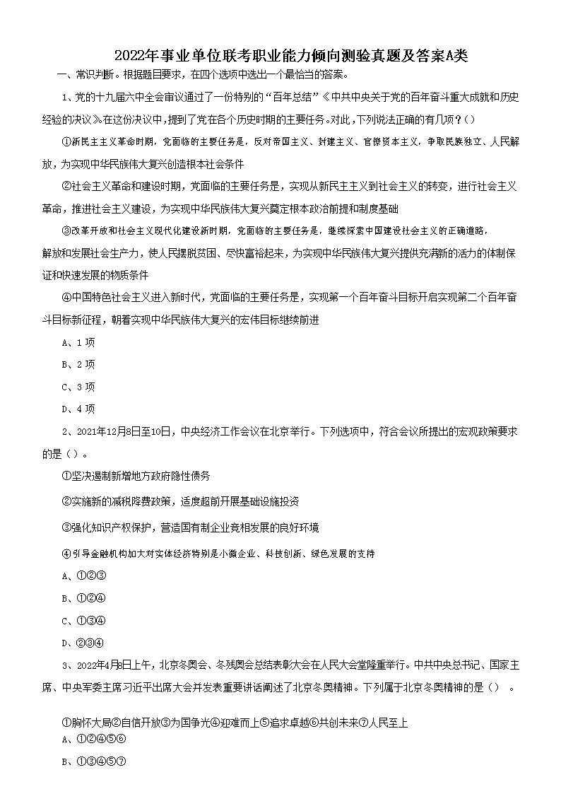【文档名称】 2022年事业单位联考职业能力倾向测验真题及答案A类(Word版).doc