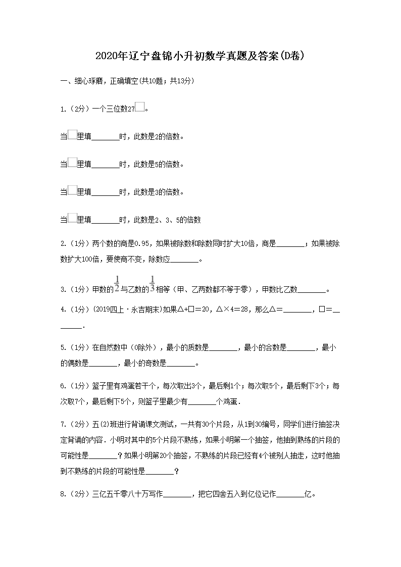 【文档名称】 2020年辽宁盘锦小升初数学真题及答案(D卷)(Word版).doc