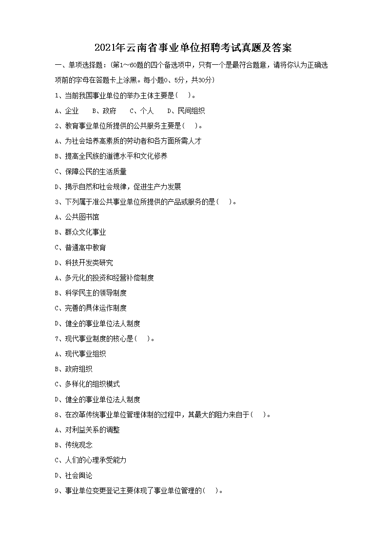 【文档预览】 无忧考网整理发布2021年云南省事业单位招聘考试真题及答案(Word版),前五页预览如下: