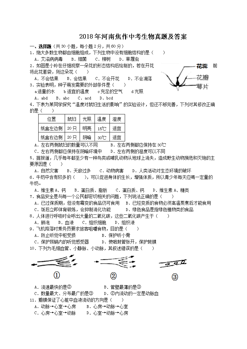 【文档名称】 2018年河南焦作中考生物真题及答案(Word版).doc