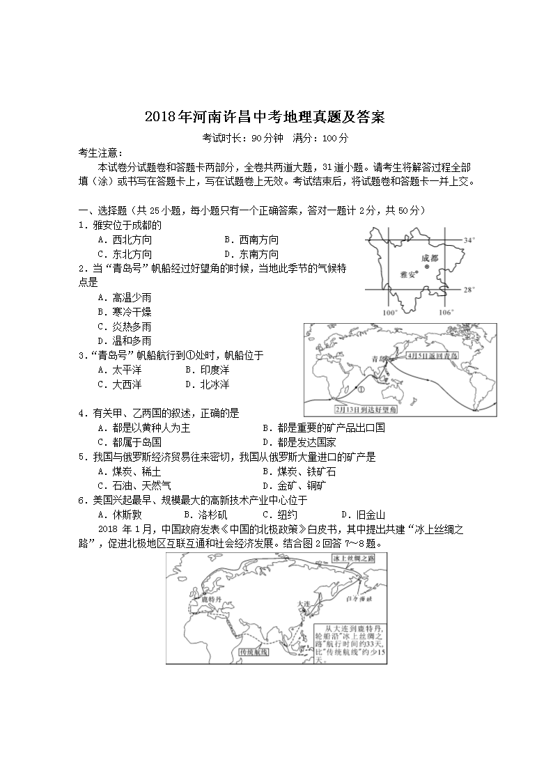 【文档预览】 无忧考网整理发布2018年河南许昌中考地理真题及答案(Word版),前五页预览如下: