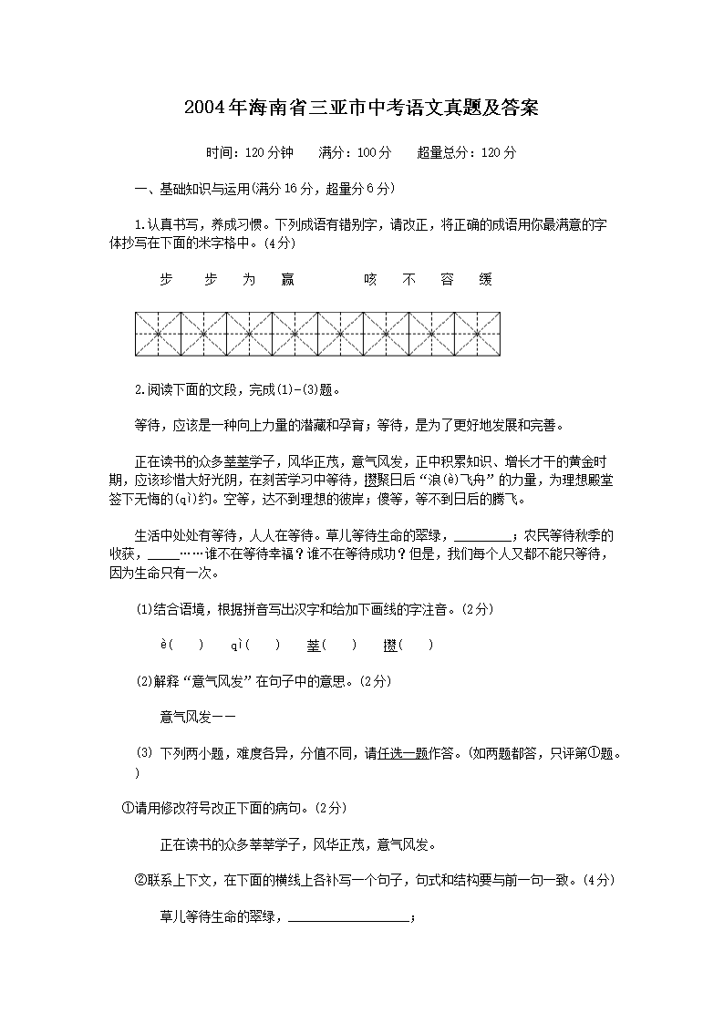 【文档名称】 2004年海南省三亚市中考语文真题及答案(Word版).doc