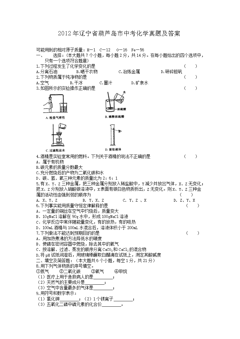 【文档预览】 无忧考网整理发布2012年辽宁省葫芦岛市中考化学真题及答案(Word版),前五页预览如下: