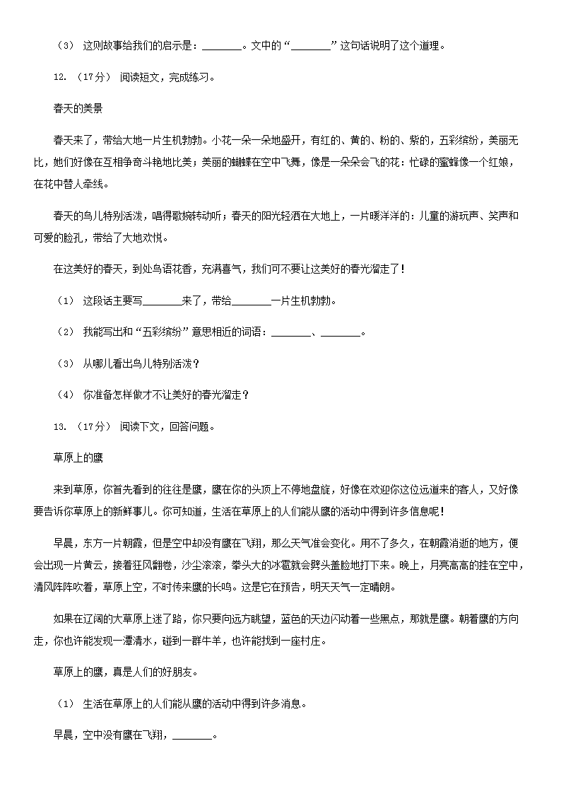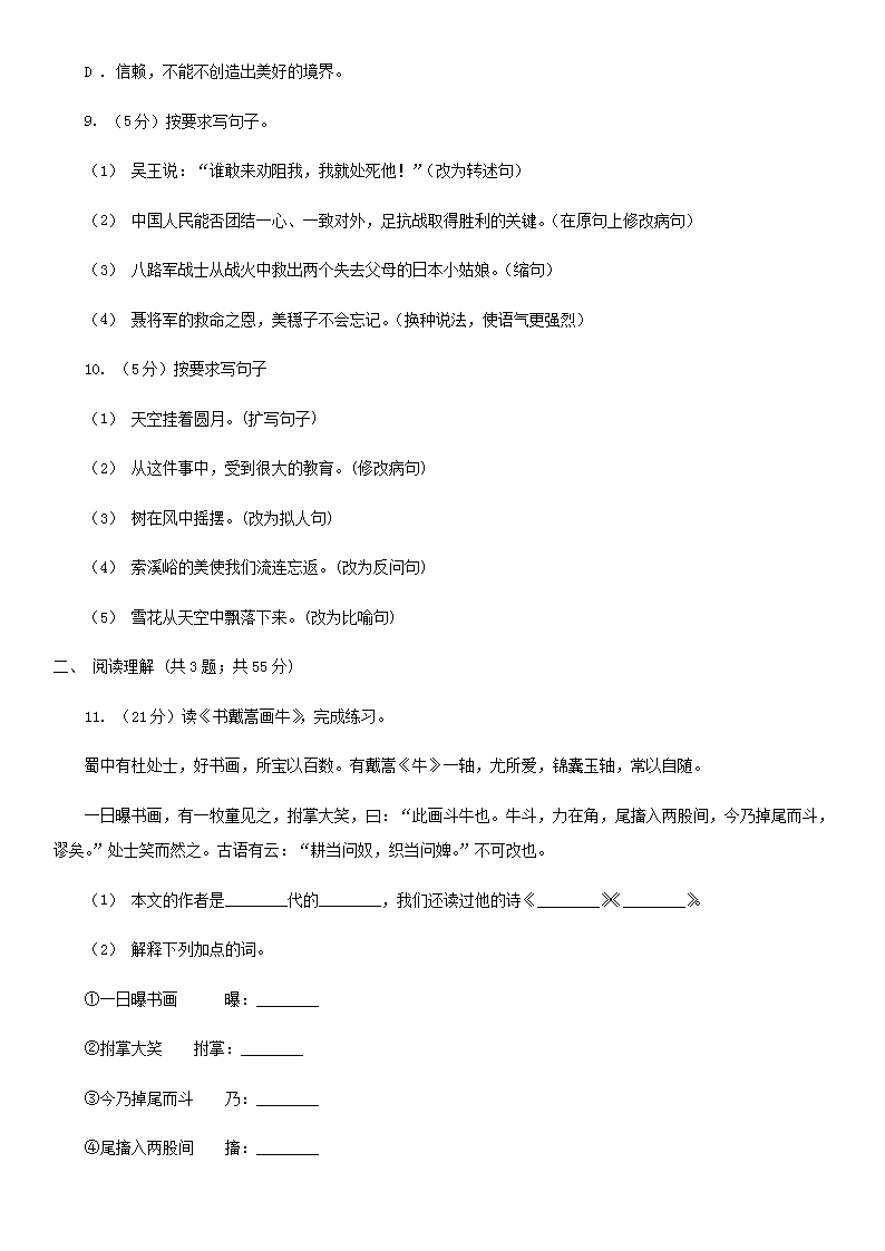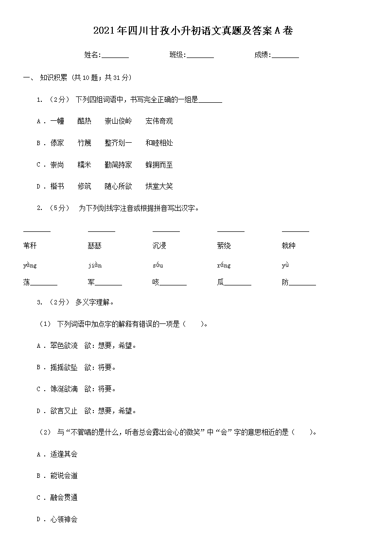 【文档名称】 2021年四川甘孜小升初语文真题及答案A卷(Word版).doc
