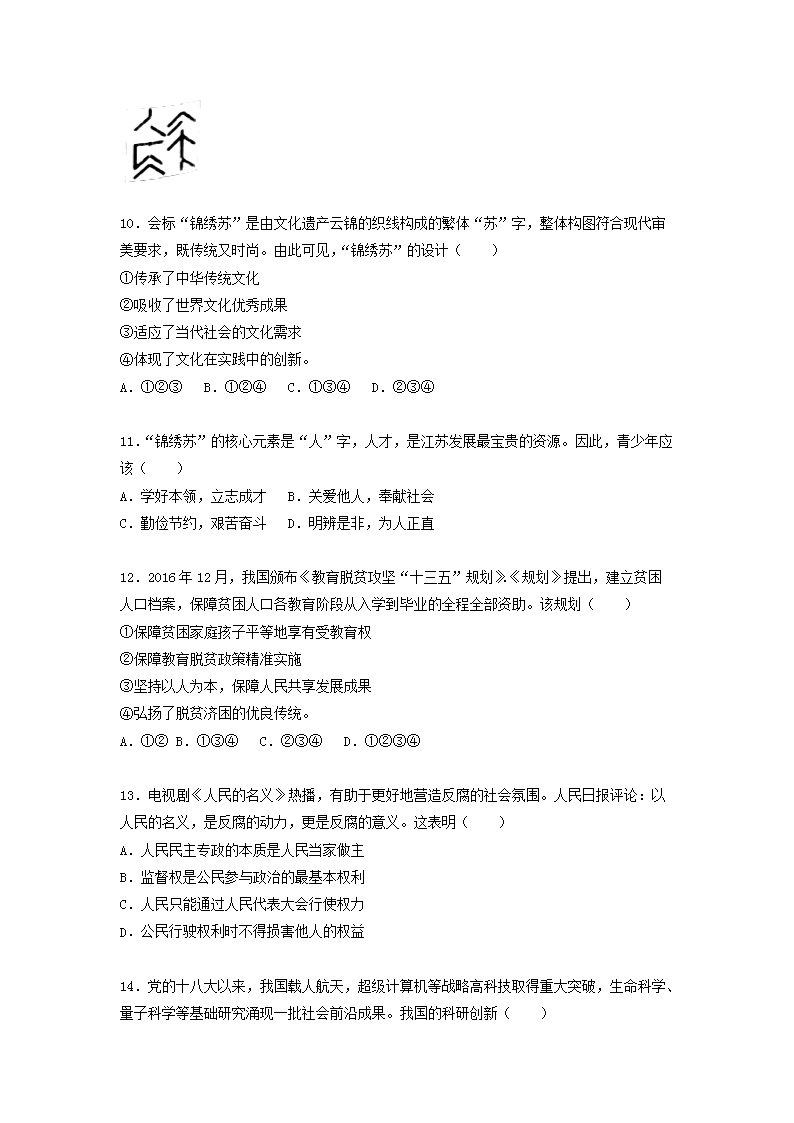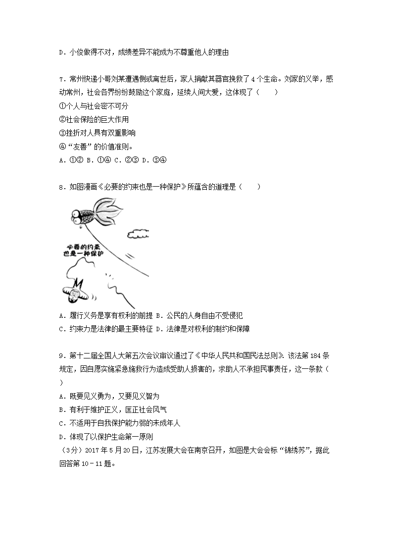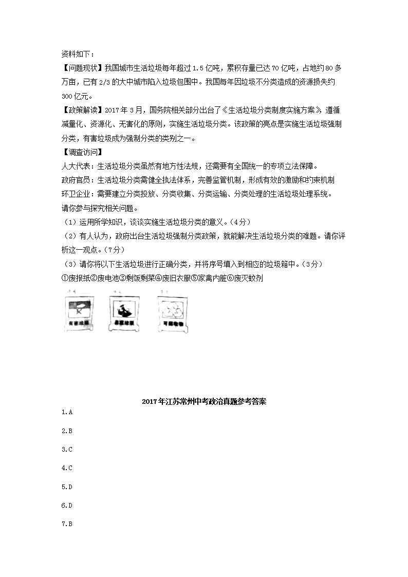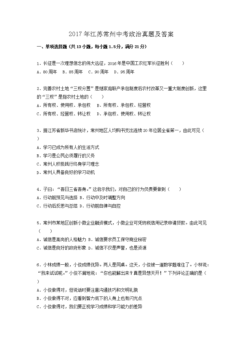 【文档名称】 2017年江苏常州中考政治真题及答案(Word版).doc