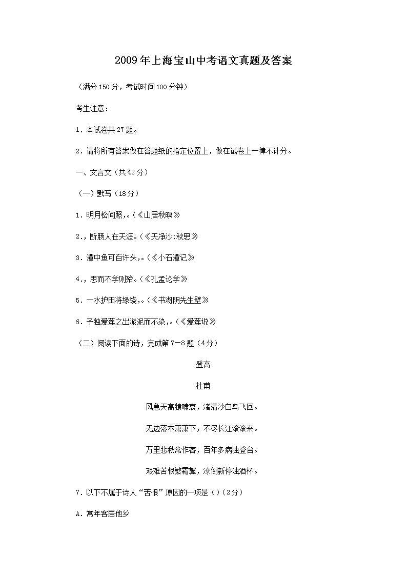 【文档名称】 2009年上海宝山中考语文真题及答案(Word版).doc