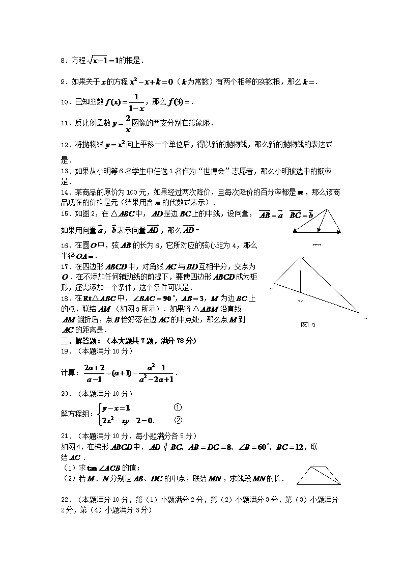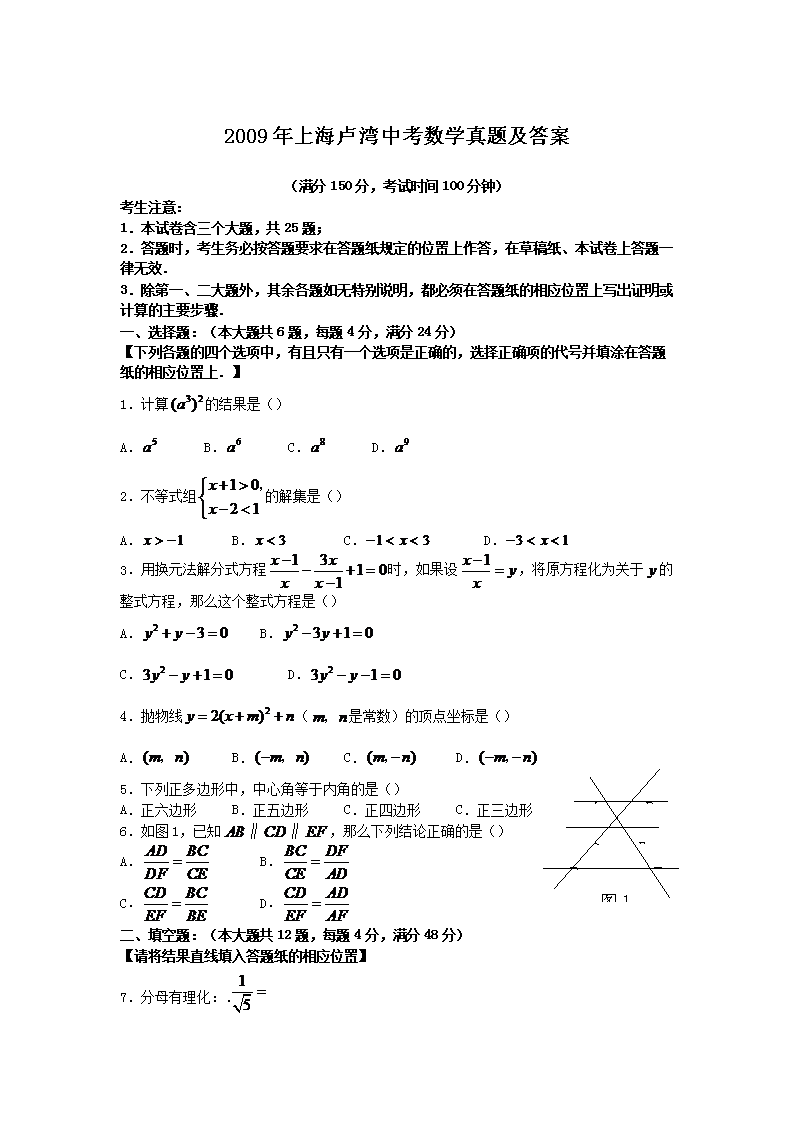 【文档名称】 2009年上海卢湾中考数学真题及答案(Word版).doc