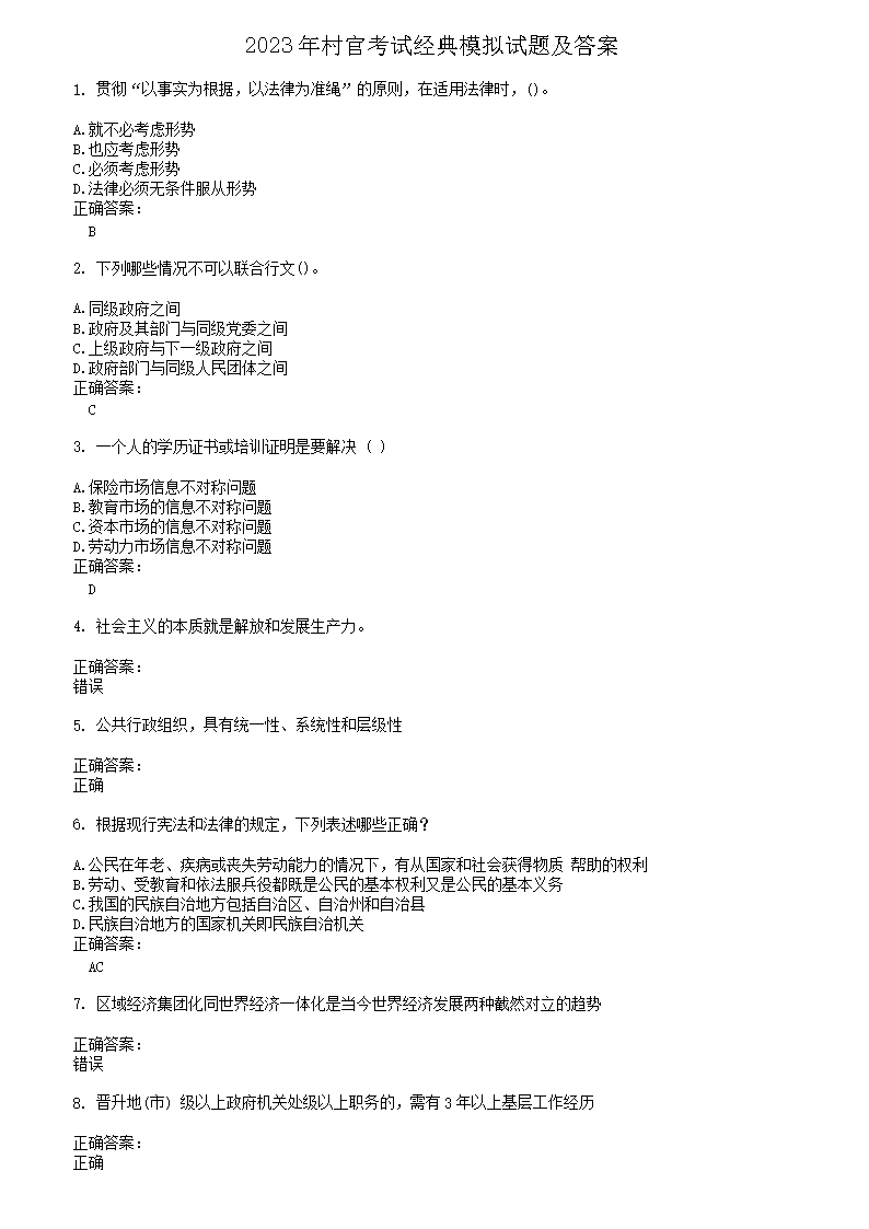 【文档名称】 2023年村官考试经典模拟试题及答案(Word版).doc