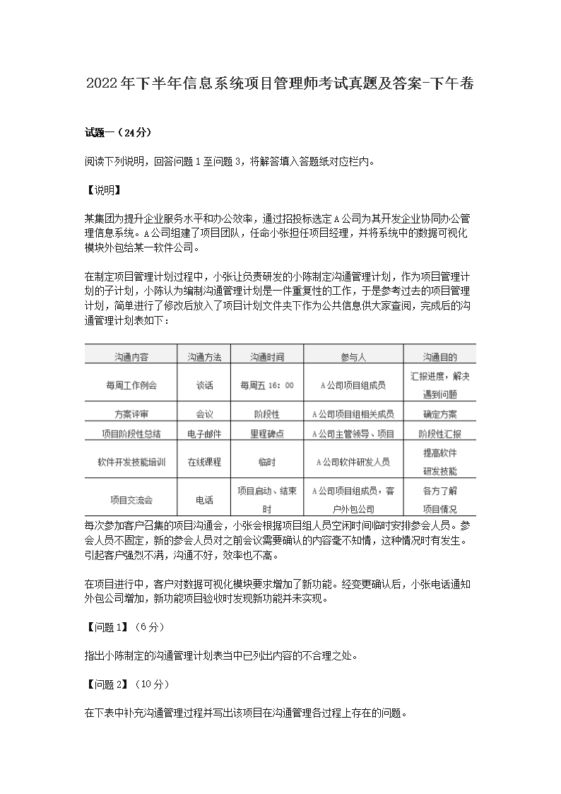 【文档名称】 2022年下半年信息系统项目管理师考试真题及答案-下午卷(Word版).doc