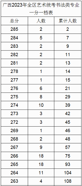 【#艺术高考(艺考)# #广西2023年全区艺术统考书法类专业一分一档表#】©无忧考网艺术高考频道从广西招生考试院了解到,广西2023年全区艺术统考书法类专业一分一档表已公布,详情如下: