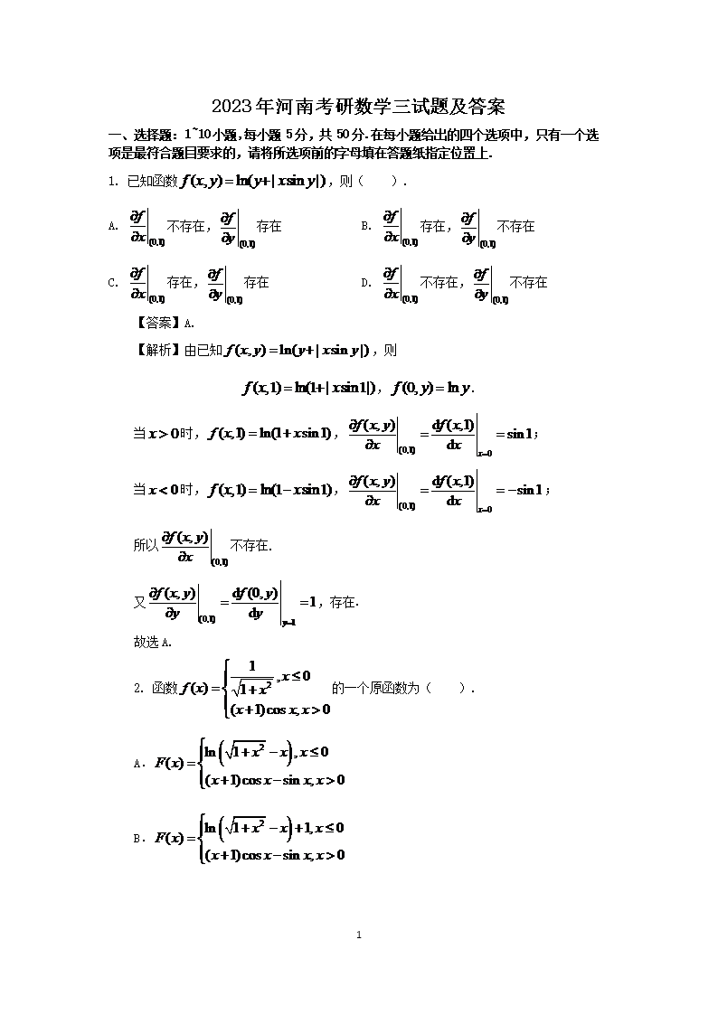 【文档名称】 2023年河南考研数学三试题及答案(Word版).doc