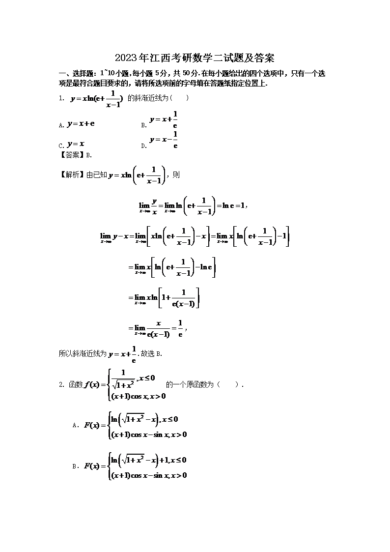 【文档名称】 2023年江西考研数学二试题及答案(Word版).doc