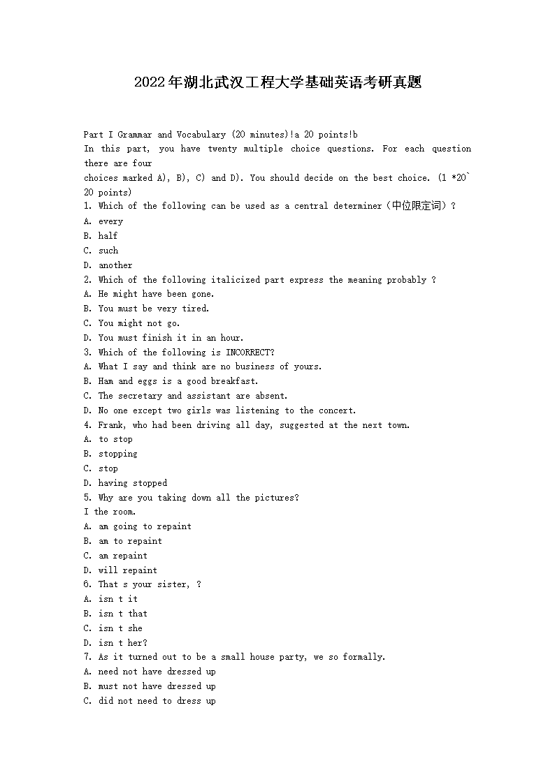 【文档名称】 2022年湖北武汉工程大学基础英语考研真题(Word版).doc