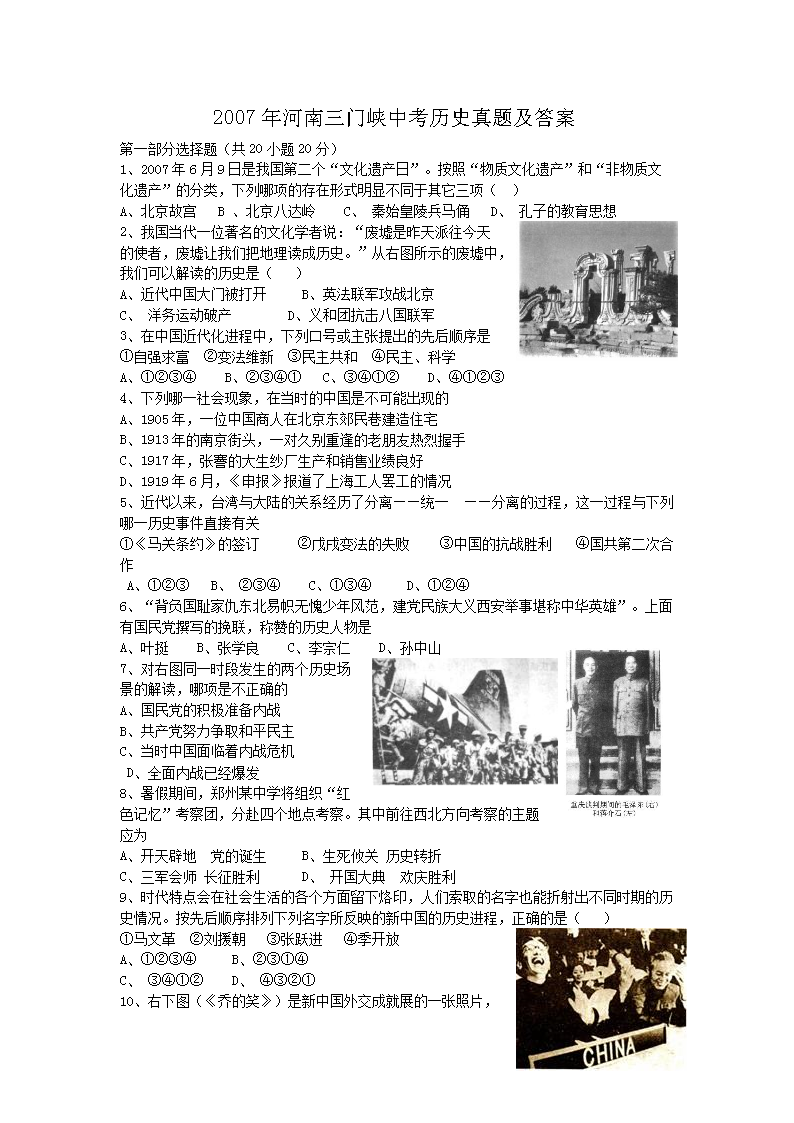 【文档名称】 2007年河南三门峡中考历史真题及答案(Word版).doc