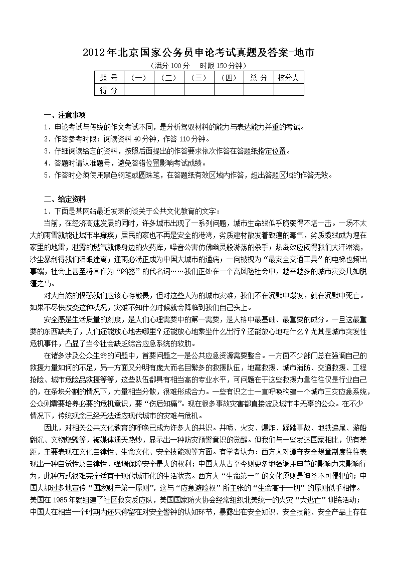 【文档名称】 2012年北京国家公务员申论考试真题及答案-地市(Word版).doc