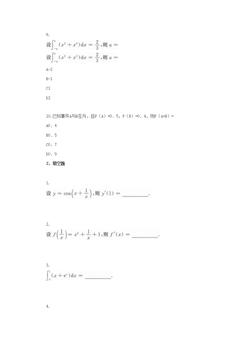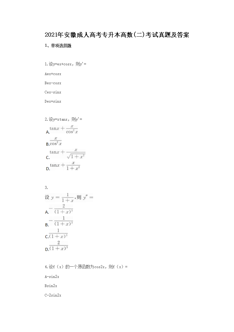 【文档名称】 2021年安徽成人高考专升本高数(二)考试真题及答案(Word版).doc