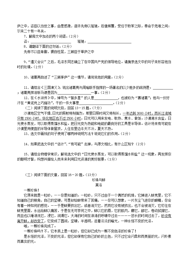 【文档预览】 无忧考网整理发布2003年黑龙江牡丹江中考语文真题及答案(Word版),前五页预览如下: