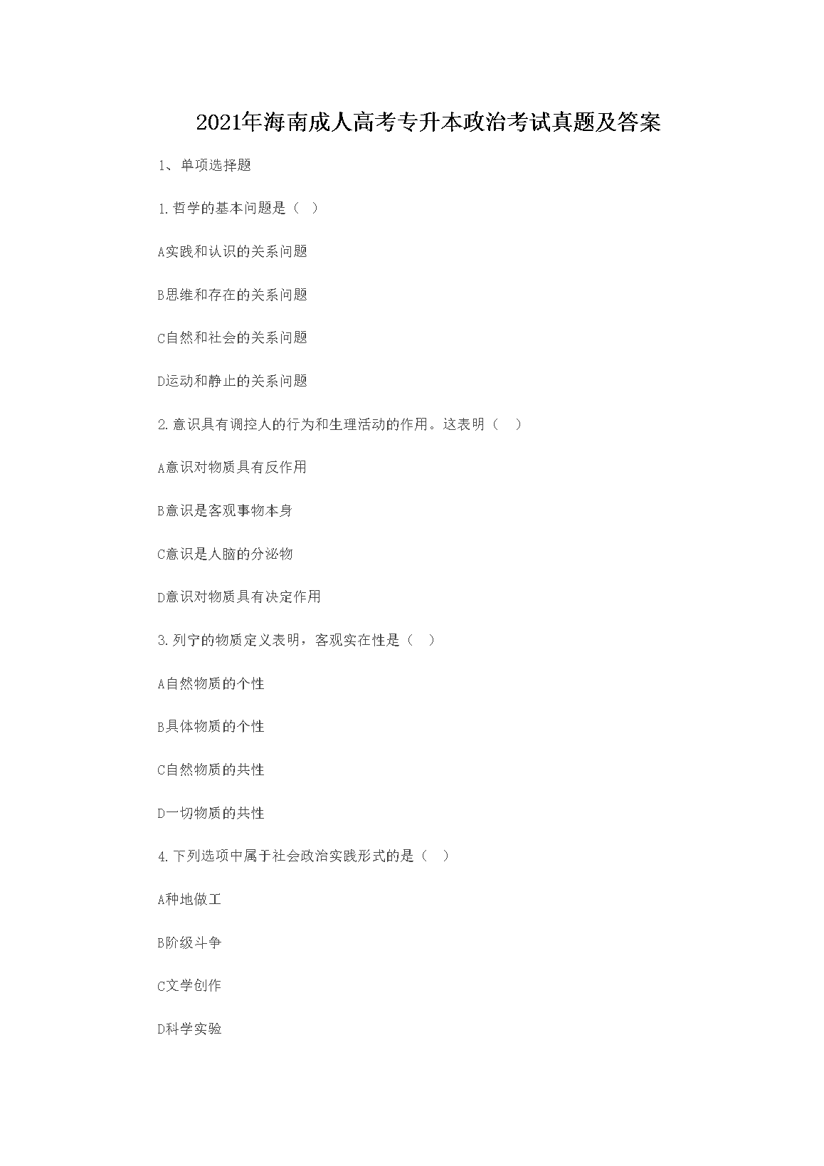 【文档名称】 2021年海南成人高考专升本政治考试真题及答案(Word版).doc