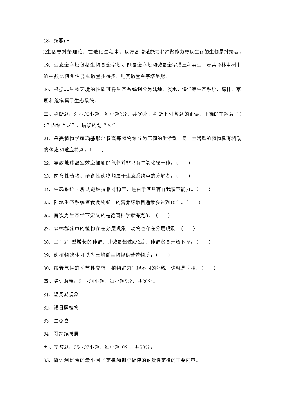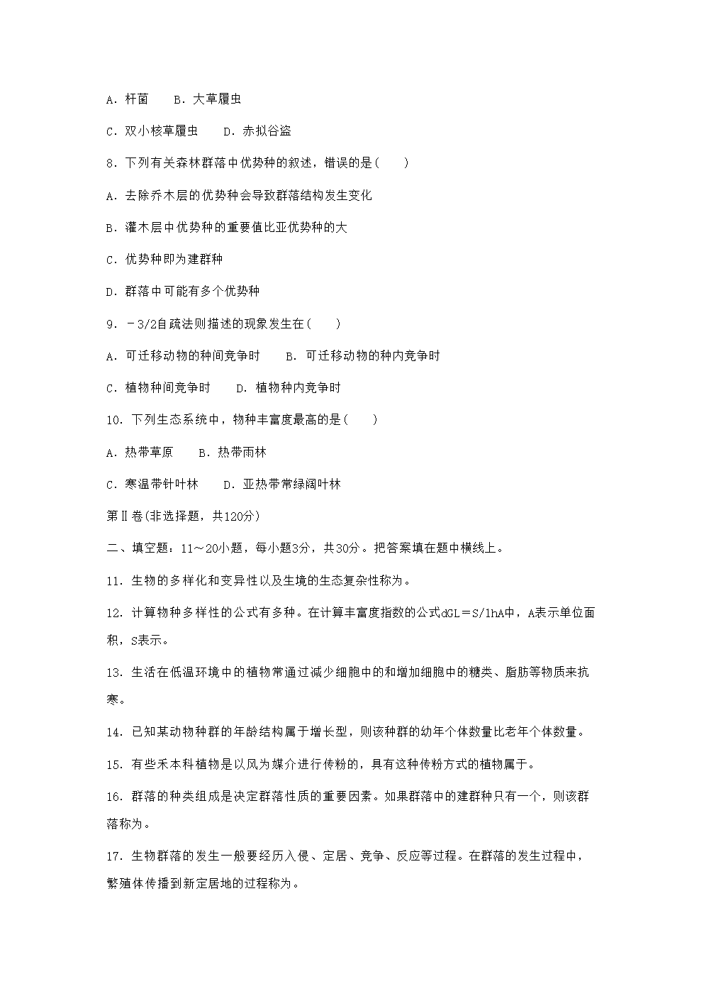 【文档名称】 2021年湖南成人高考专升本生态学基础考试真题及答案(Word版).doc