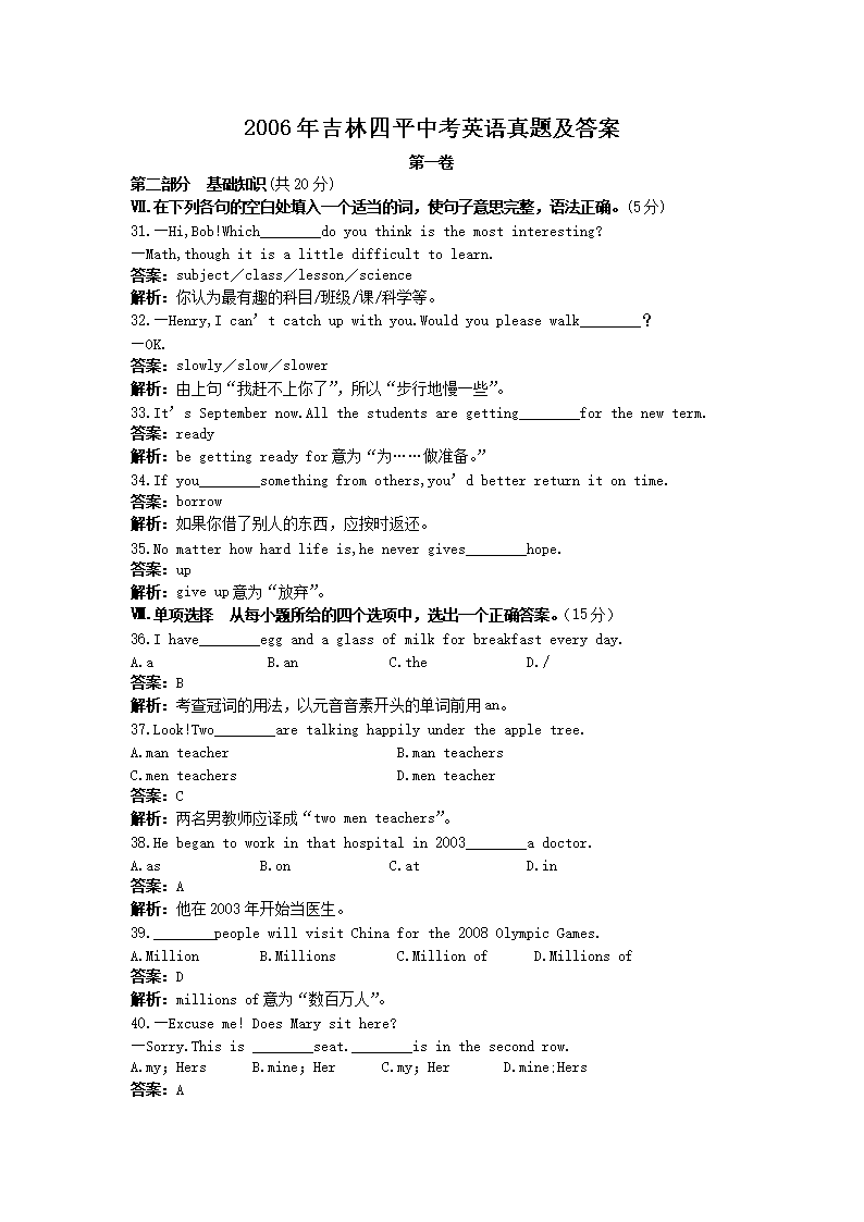【文档名称】 2006年吉林四平中考英语真题及答案(Word版).doc