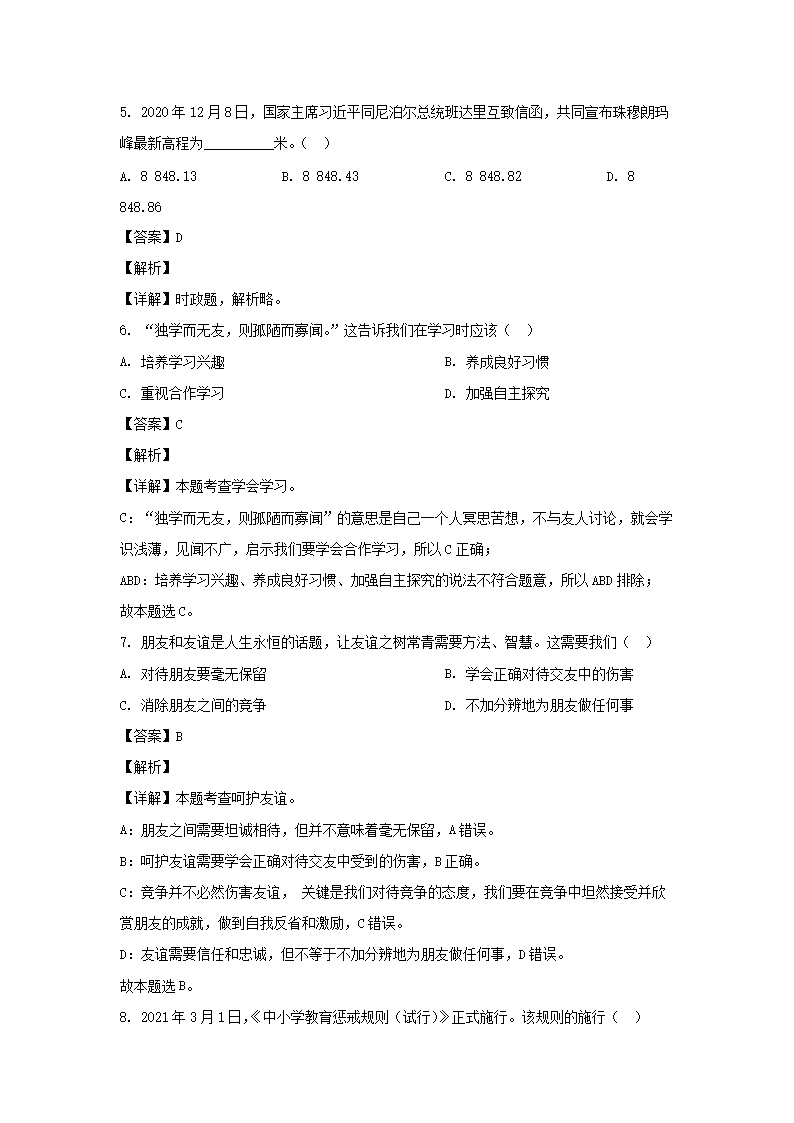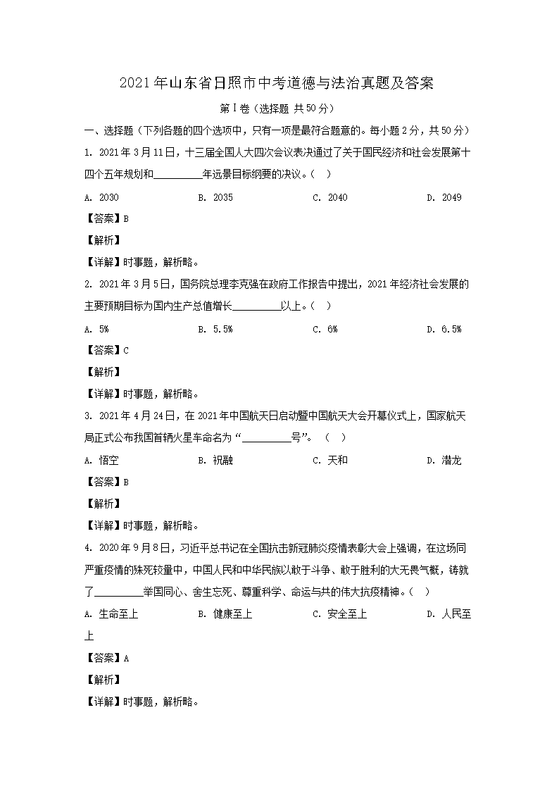 【文档名称】 2021年山东省日照市中考道德与法治真题及答案(Word版).doc